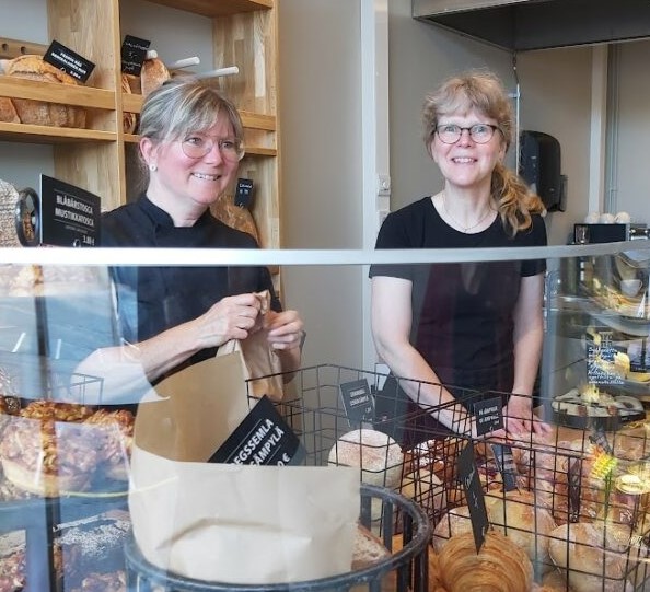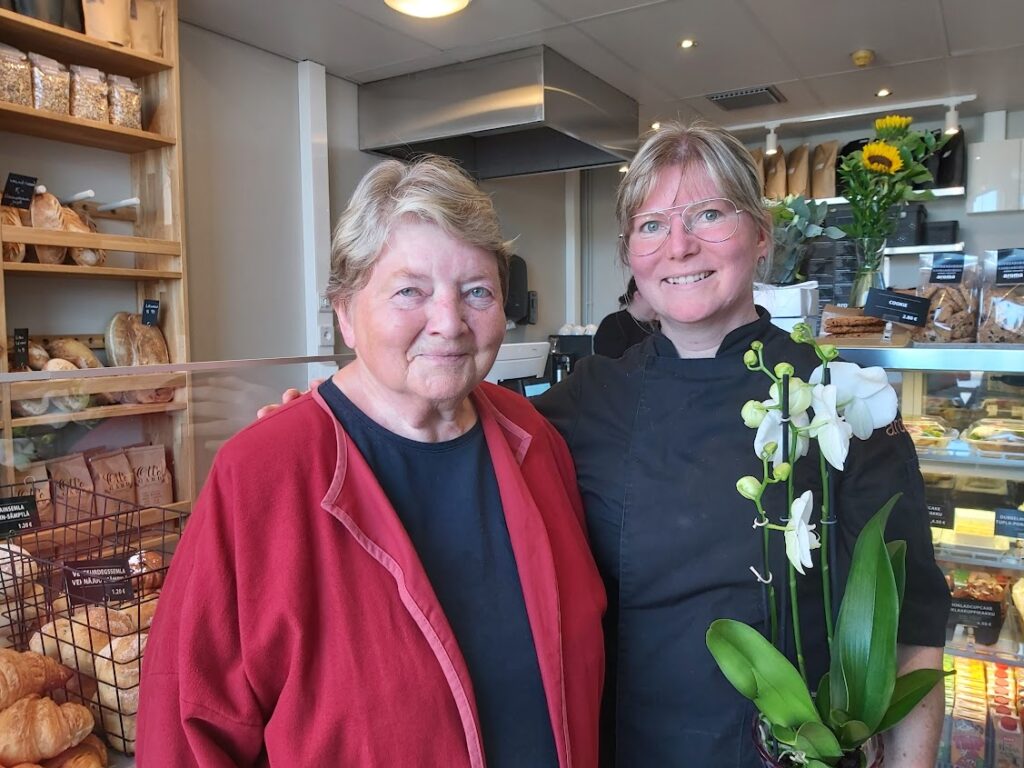 Aroman omistaja Maria Vestergård ja Sabina Engsbo-Åkerman myyvät leivonnaisia ja herkkuja. – Aromas ägare Maria Vestergård och Sabina Engsbo-Åkerman säljer bakverk och delikatesser.