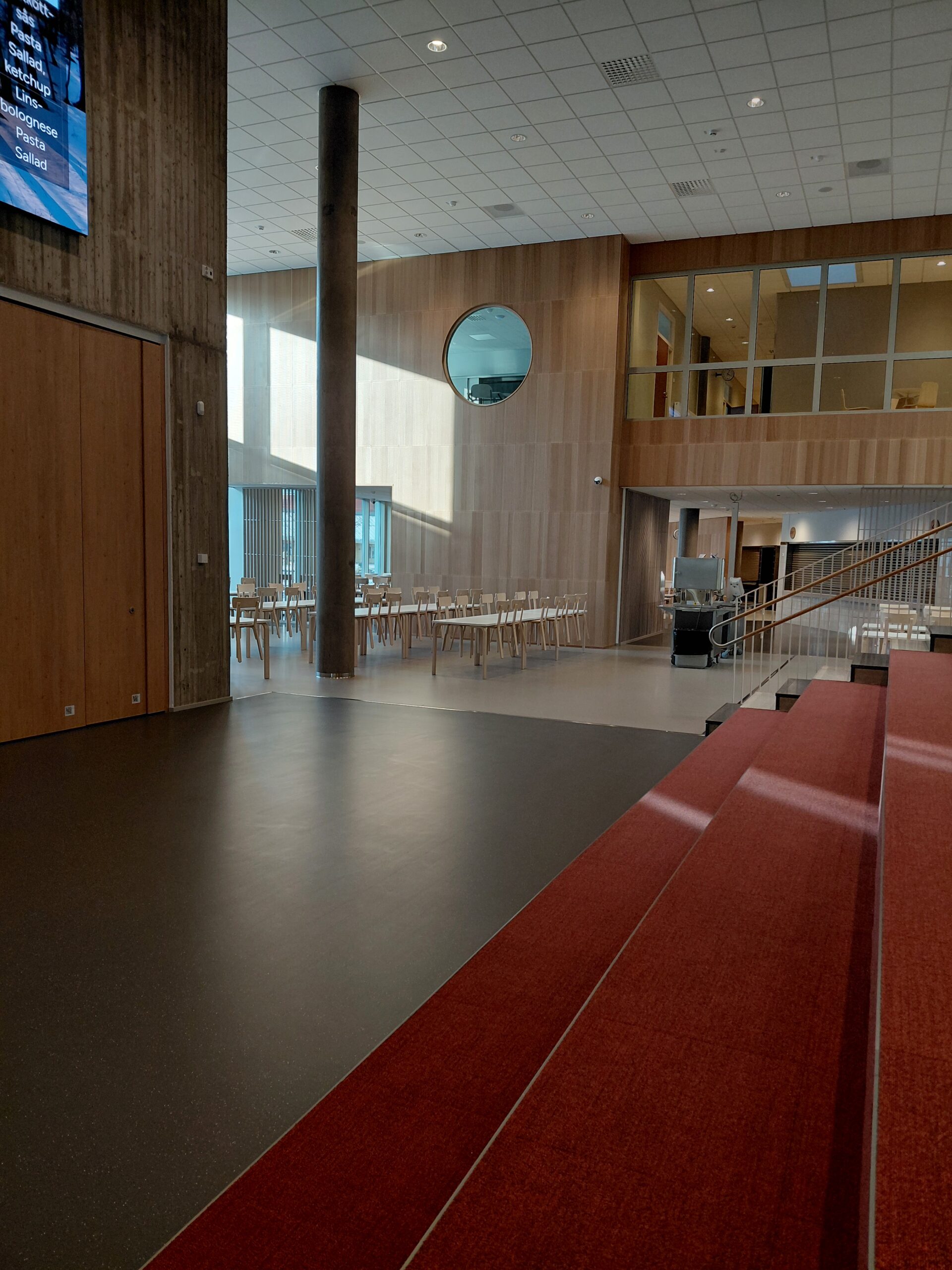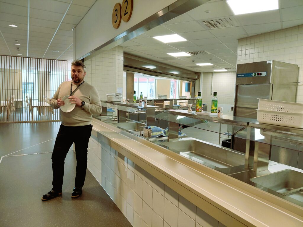 Utrymmena är ljusa och fräscha och i jordnära färger. Kosthållschefen Marcus Åkerblom guidade besökarna i den rymliga matsalen och visade hur matserveringen fungerar. Det gäller 1550 personer i tre turer så att allt måste vara bra planerat i förväg. I den nya matsalen används inga brickor och tallrikarna är universaltallrikar, alltså det finns inte tallrikar och djupa tallrikar skilt.