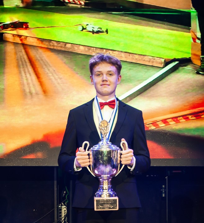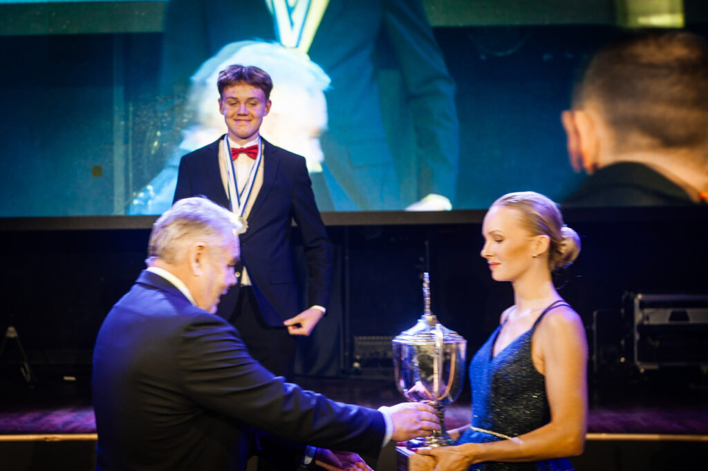 Vuoden pienoisautoilja Kristian Ullakko AKK:n palkintogaalassa. – Årets RC-bilförare Kristian Ullakko på AKK:s prisgala. Foto: Ilmari Ullakko.