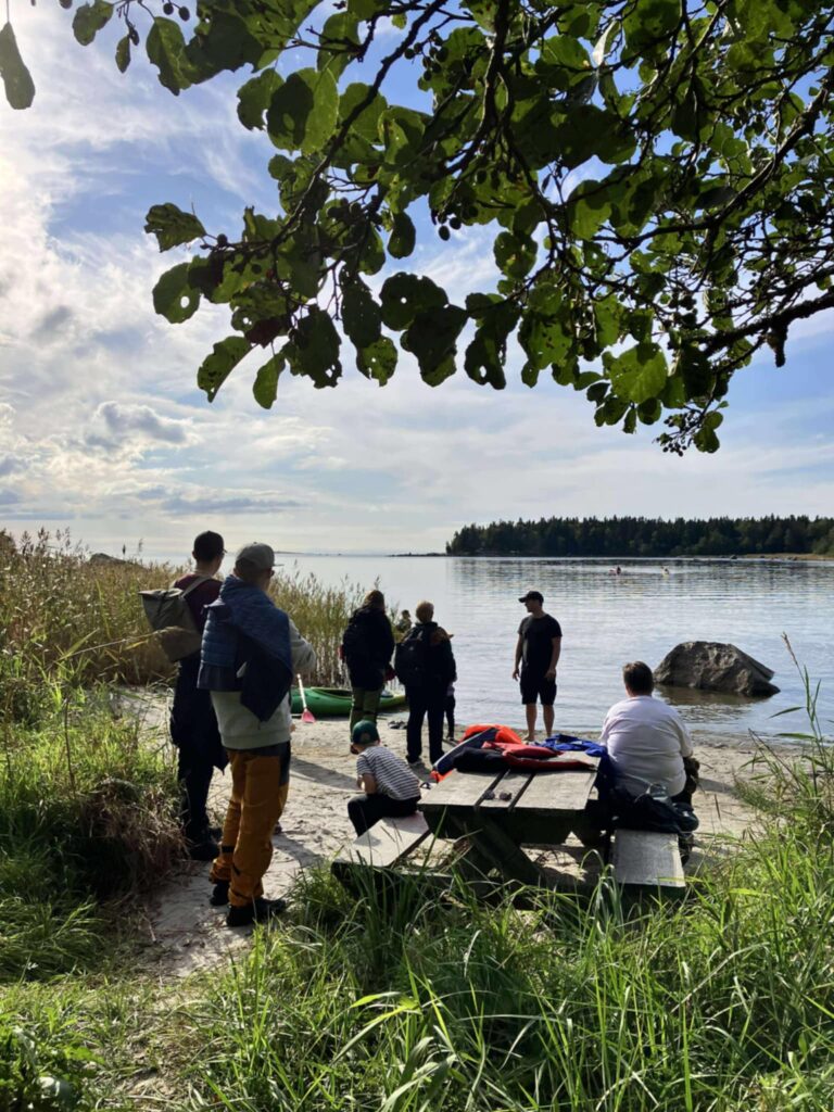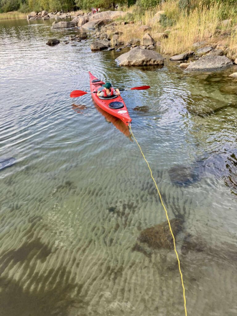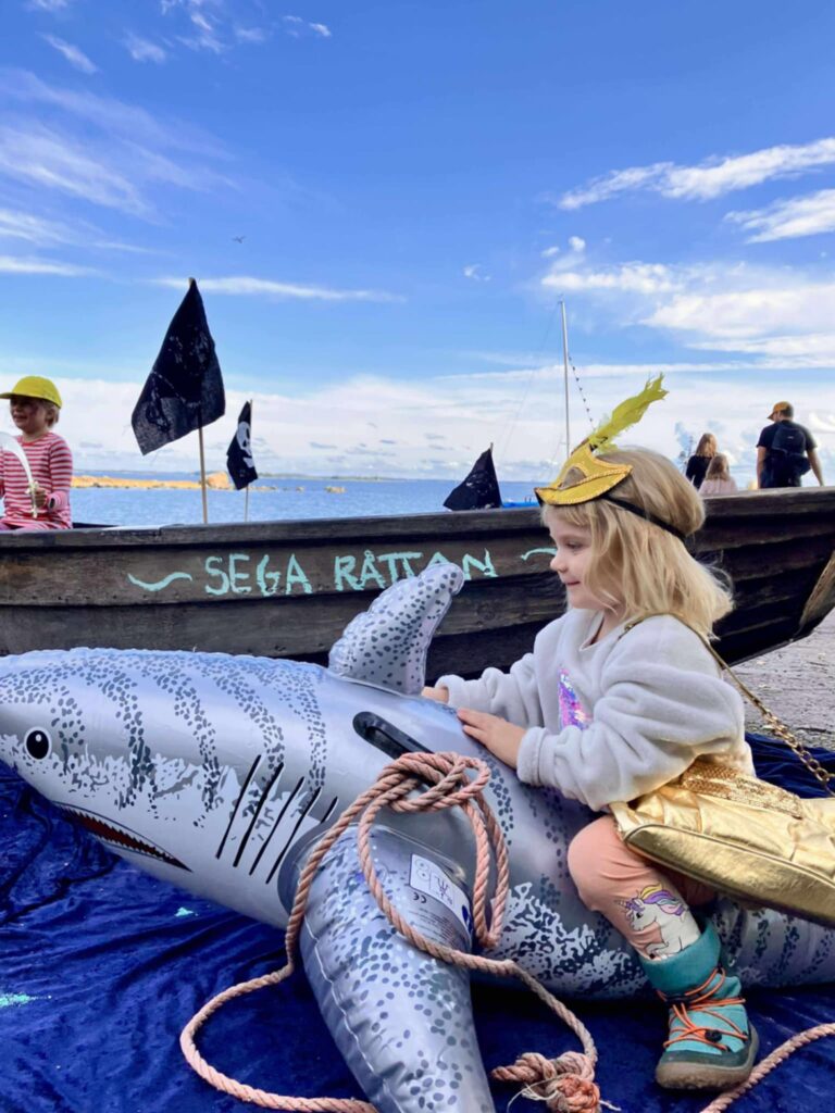 Vid simstranden fick piraterna prova på kajakpaddling. Några av de allra minsta barnen fick uppleva kajakturen tryggt i en vuxens famn. Den yngsta paddlaren var bara tre år gammal – en blivande sjöfarare. Även andra sjökunskaper kunde övas tillsammans med simlärarna.